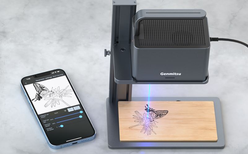 Here is another portable laser machine with app connectivity that lets you etch your designs on paper, wood, bamboo, acrylic, and other surfaces. The Jinsoku Z4 Laser Engraver comes with Bluetooth 5.0 connectivity. It has a 450nm blue laser and 600mm/s engraving speed.