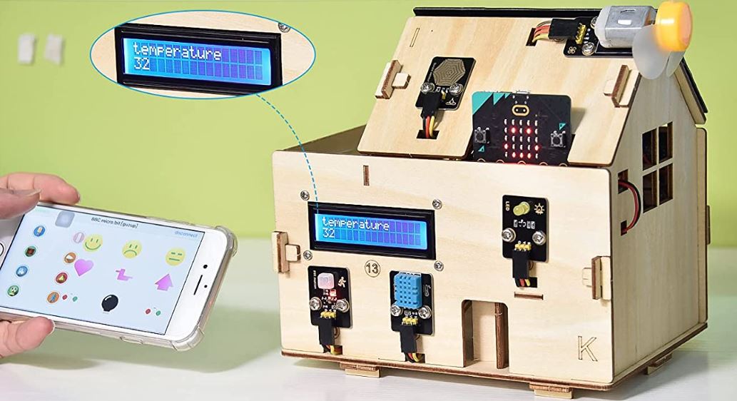 This kit ships with a micro:bit v2 board. It comes with a bunch of courses that show you how to program this smart home (including 14 Python lessons and 18 MakeCode projects). The KEYESTUDIO Smart Home is compatible with iOS and Android devices.