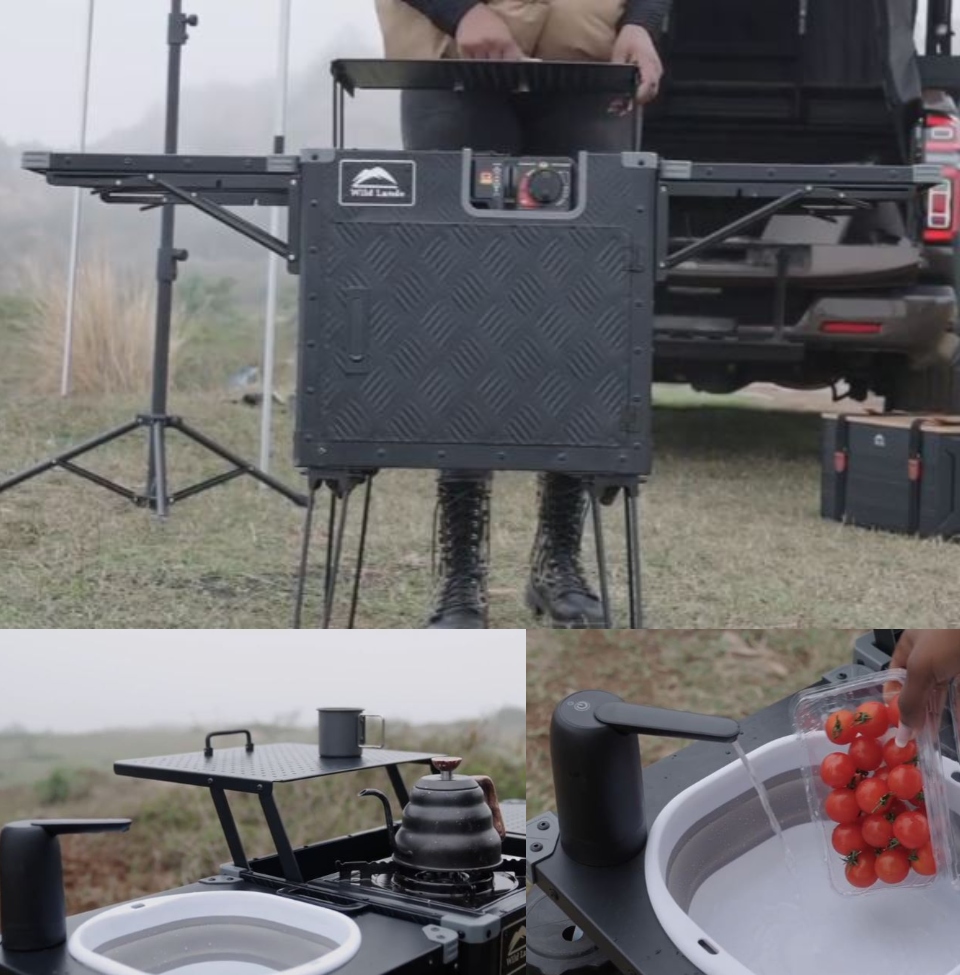 The Kitchen Cruiser can be assembled in seconds. It has a space-grade aluminum structure with reinforced legs. It also has a wind deflector to keep the flame going. You also get running water.