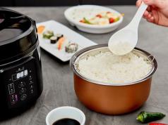 This rice cooker has a touchscreen display that you can use to select the right cooking mode. With delayed cooking, you can add ingredients ahead of time for cooking to begin 24 hours later. It has a steamer basket and non-stick ceramic pot. The KGC3155 cooker has 7 grain, 8 rice, and 6 bean presets.