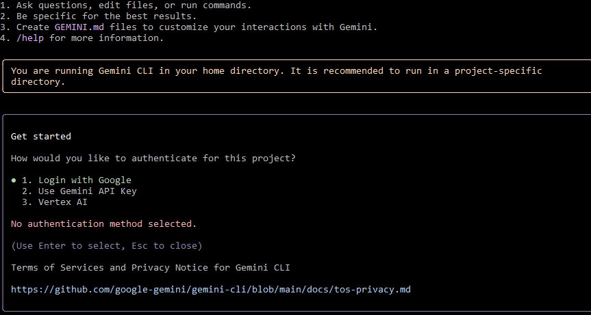 Finally, we used “npm install -g @google/gemini-cli” to install Gemini. Once there, we just had to grab our API from Google AI Studio, and the rest was easy. When you run the Gemini command in your terminal, you will be given the following choices (we went with #2).