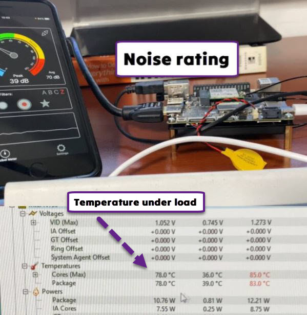 We used HWMonitor to check the temperature of the device as we installed apps such as Arena Chess, Stockfish, and Gemini CLI. It never went over 85 °C for us, even under load. Max fan noise level was around 55 dB. Our IOTA loaded in about 25 seconds. While we used a USB-C adapter, it is possible to use a 4-pin PH 2.0 power connector (10-15V) to power this.