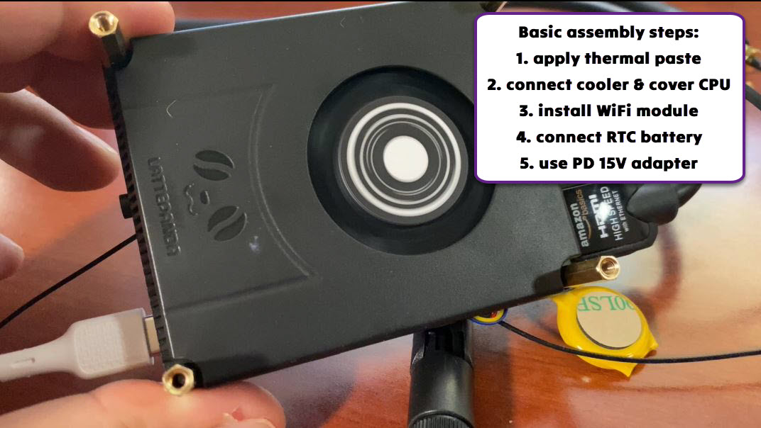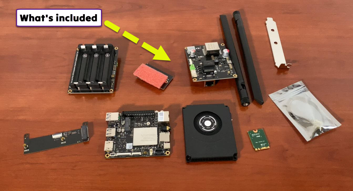 We were sent a LattePanda IOTA with 8 GB RAM and 64 GB of storage space. For something like this, you are going to need a decent cooler, which in our case was included. We were also sent a smart UPS HAT, PoE++ Hat, M.2 4G expansion board and an M.2 M-key SSD expansion board. There was also a WiFi module with antennas, which you can use for wireless applications. Even with little experience on this platform, we were able to put the most basic configuration together. For that, we used the cooler, the main board, an RTC battery that was included in the package, thermal paste, and the WiFi module.