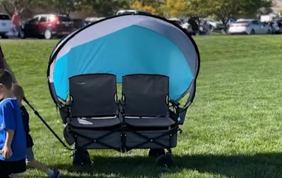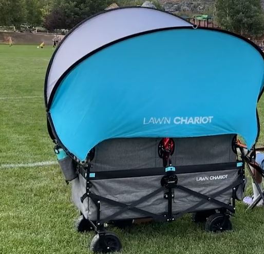 Lawn Chariot folds to fit in the trunk of your car. It has 5.3. cut. fit capacity. You can use this to haul up to 330lbs of things. Its QuickCover canopy can be set up in seconds and has UPF 50+ weather protection. It features coaxial steering, so you can make easy turns when moving heavy loads. You can find this project on Kickstarter.