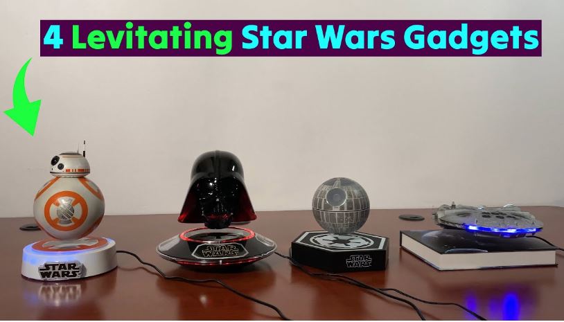 Here is a set of 4 rare Star Wars gadgets that defy gravity. These 4 levitating Star Wars gadgets are easy to float. The Motorized BB-8 Toy moves on its own. It also has an illuminated base. The Death Star is a Bluetooth speaker that plays audio from your phone or tablet. The Millennium Falcon has a speaker base and lights up when you levitate it.
