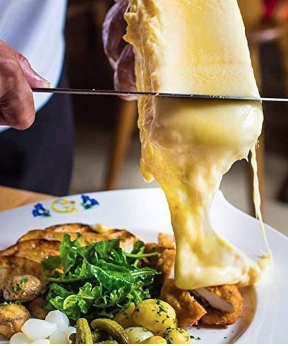 Once your cheese is melting, you can lift the cheese holder into an angled position and scrape the surface with a raclette knife. This cheese melter measures 22.05 x 15.75 x 4.33″.