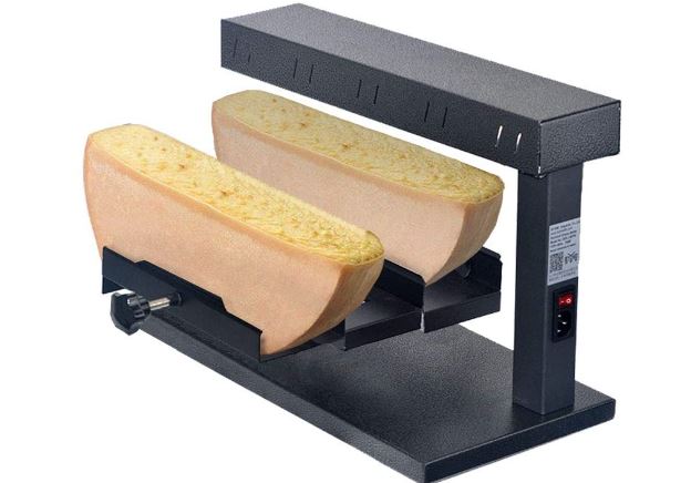 Here is a cheese melting machine that uses a 650W heating tube to quickly heat your cheese. The Li Bai Dual Electric Cheese Melter has room for 2 half rounds of cheese. It has a 46cm base plate. To get started, put the cheese on the holder, clamp it into position, turn it towards the heater (2cm distance), and you are set.