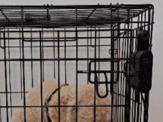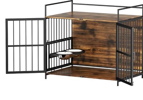 Here is a dog crate that doubles as a side table to hold your things. The LOVMOR Dog Crate Side Table has an adjustable dog feeder with 2 stainless steel dog food bowls. You can adjust these to 3 heights. This dog cage has a heavy duty design with a steel tube structure. It has a footprint of 41 x 3.58 x 23.6″.