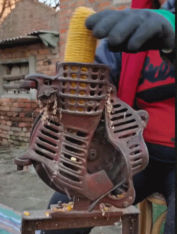 Here is a manual corn sheller that lets you remove corn kernels with less effort using a crank mechanism. You simply have to crank the handle clockwise. It has an adjustable design to accommodate corns of all sizes. This sheller can be fixed on a stool.