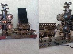 Lawn mower transmission parts, industrial roller chain links, brass air fittings, copper electrical connectors, and various other items were used to make this.