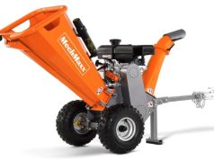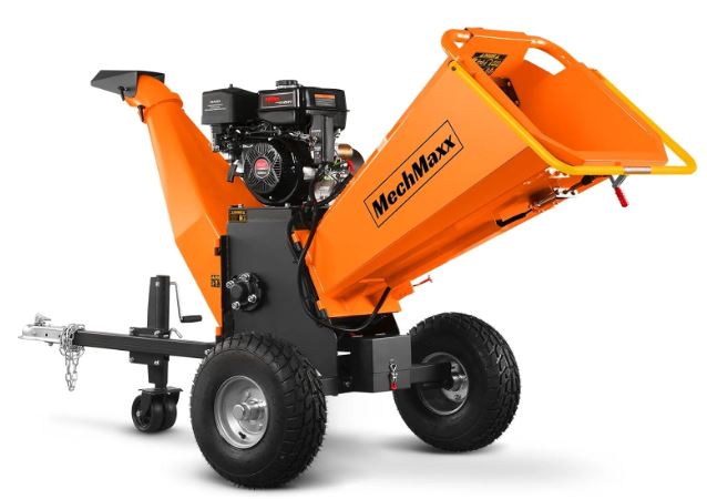 This is the MechMaxx P4206: a 420cc 15hp Gas Engine Wood Chipper ready for all your wood shredding tasks. It can handle up to 6-inch diameter wood and branches. It features double-edge reversible blades. The feeding chute and discharge chute can be opened for maintenance. This powerful wood chipper has Kevlar belts. It has a trailer bar and 2 front wheels for easy transportation.