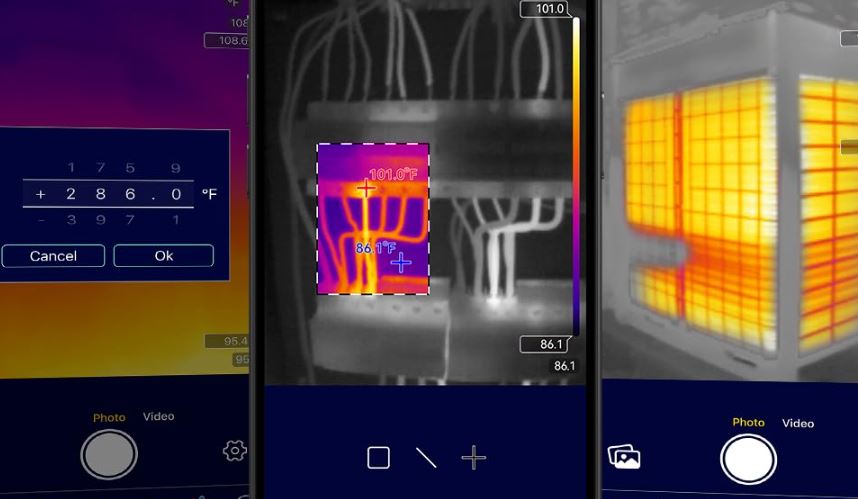 This thermal camera can track max, min and central temperatures of objects around you. You can add lines and boxes to monitor specific regions. There are 12 color palettes for you to choose from. Here are the main specs for this camera: