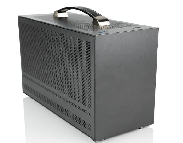This mini gaming PC features a leather handle. It uses an air cooler for efficient cooling performance. There is also a perforated top & bottom panel. Here are the specs: