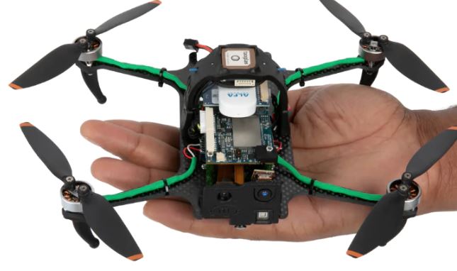 The Starling weighs only 275g. It is powered by the Qualcomm QRB516 with 8 cores. It comes with WiFi connectivity and relies on open source software (ROS 1/2, OpenCV).