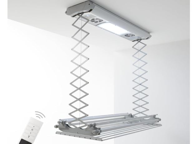 Here is a space-saving ceiling drying rack that is motorized and can be controlled with a remote. It can descend from ceilings up to 6ft and can hold up to 77lbs of load. It also has a LED light and fans. You get 24 positions to hang your clothes. You can install this in laundry room, balcony, bathroom, and anywhere else.