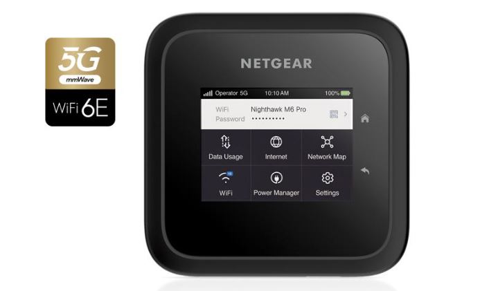 Meet the NETGEAR Nighthawk M6 Pro: a 5G mmWave and WiFi 6E mobile hotspot router that helps you stay connected. This palm-sized gadget delivers speeds up to 8Gbps, so it can handle multi-gig downloads and fast uploads. The M6 Pro lets you connect up to 32 devices. It also has a built-in firewall.