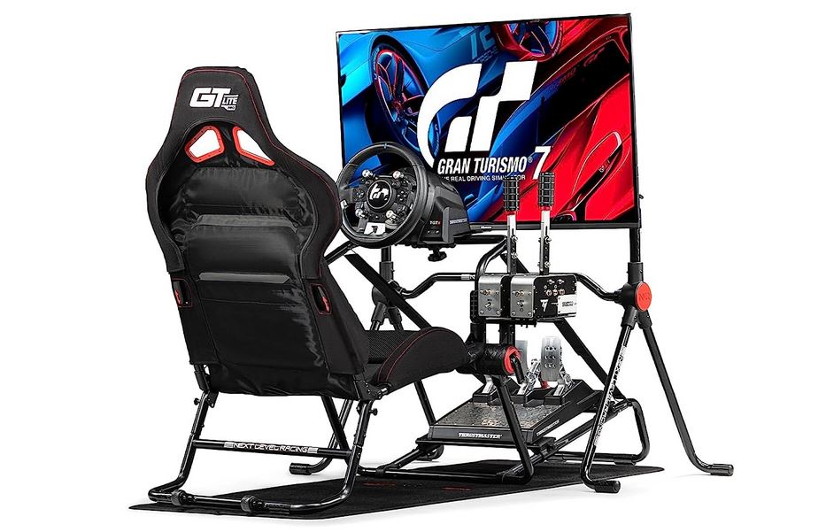 This is the Next Level Racing GTLite Pro (NLR-S031): a foldable racing cockpit that takes your gaming experience to the next level. It has a padded seat and lumbar to keep you comfortable. It can be assembled fast and is compatible with DD wheelbases up to 13 Nm. This racing cockpit has a shifter and handbrake mount.