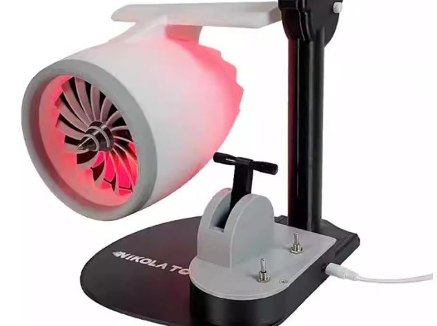 Here is a cool gift idea for aerophiles. The NikolaToy Desktop JetFan is a jet engine inspired fan with adjustable speed, humidifier and red tail lights that puts on a show on your desk. This fan has 3D printed parts. It has an ultrasonic atomizer to add moisture to your air. Its red tail light creates a cooler effect.