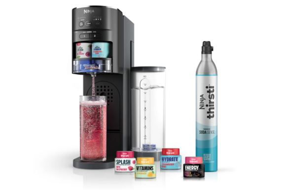 This is the Ninja Thirsti Drink System: a hydration system that lets you create 1000s of fizzy drinks. It uses a 60L CO2 cylinder to get the job done. You can customize fizz, function, flavor intensity and drink size. You can use this to make 6oz, 12oz, 18oz and 24oz drinks.