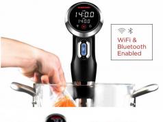 Meet the new Nomiku: a WiFi connected sous vide immersion circulator for your kitchen. We have already had the pleasure of covering the previous version of this device a while ago. The new model is smaller than the previous version and now clips onto the front of your pot. You get a single knob to control the temperature and a large touch screen.
