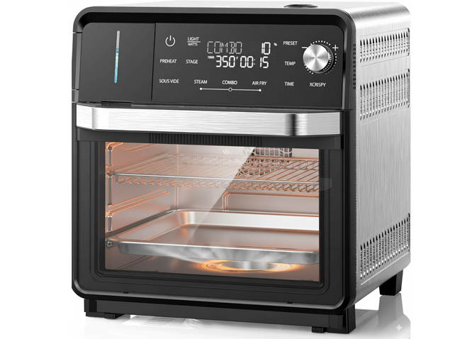 This is the Nuwave Combi Steam Oven: a multifunctional oven with 120 presets that replaces multiple appliances. It can serve as an air fryer, steamer, and sous vide cooker. You don’t even need to use a water bath to make restaurant quality food. This oven has an adjustable temperature from 50 to 450F. It has enough room for a 5lb chicken and 20 wings.