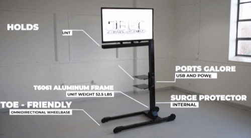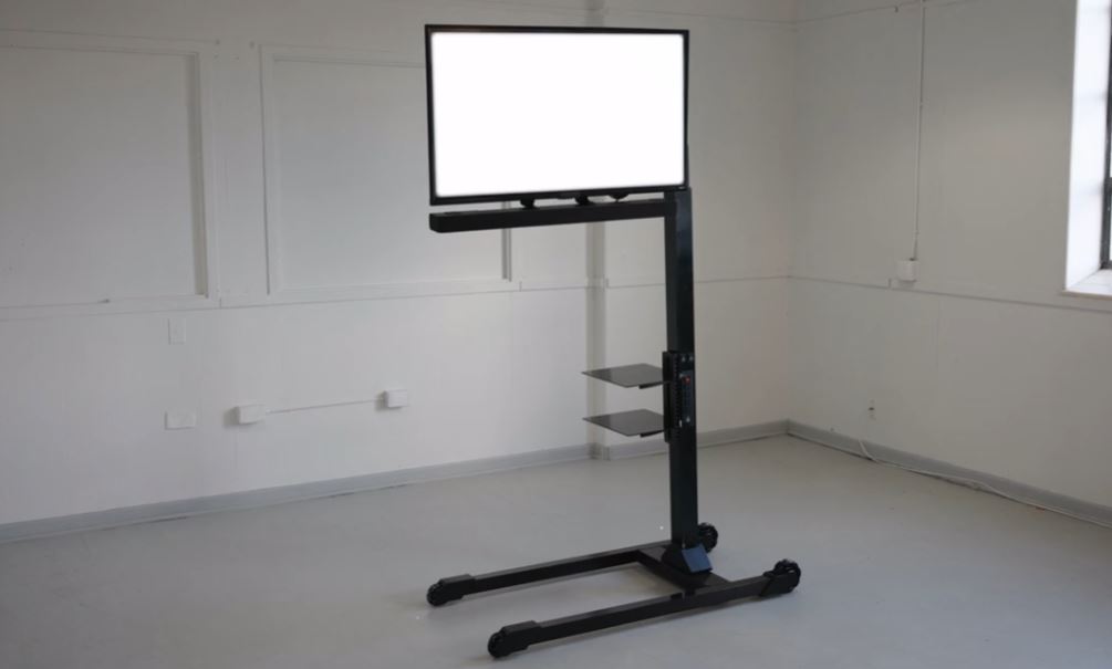 You can easily roll this underneath a bed to suspend a TV and soundbar above it. The OBEC is 90-degree tilt-able. It has outlets and USB ports for charging your phone and other devices. The OBEC comes with an omnidirectional wheelbase, a telescopic central column, and a top arm that allows for easy TV adjustment.
