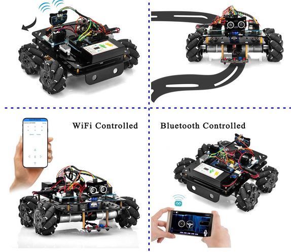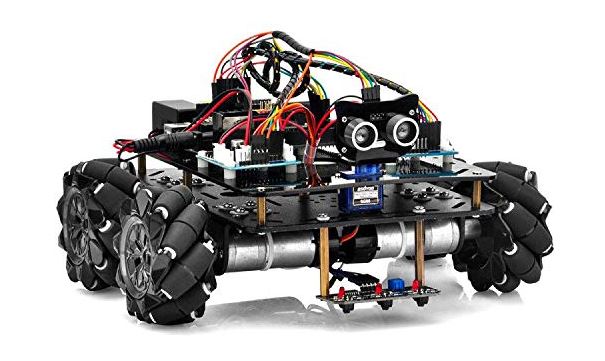 Here is another robot kit made for serious developers. The OSOYOO Omni-directinal Mecanum Robot Car can be controlled by an Android or iOS app. It can move in all directions, track lines, and avoid obstacles. This kit ships with WiFi shield, servos, sensors, voltage meter, battery, and board for Arduino.