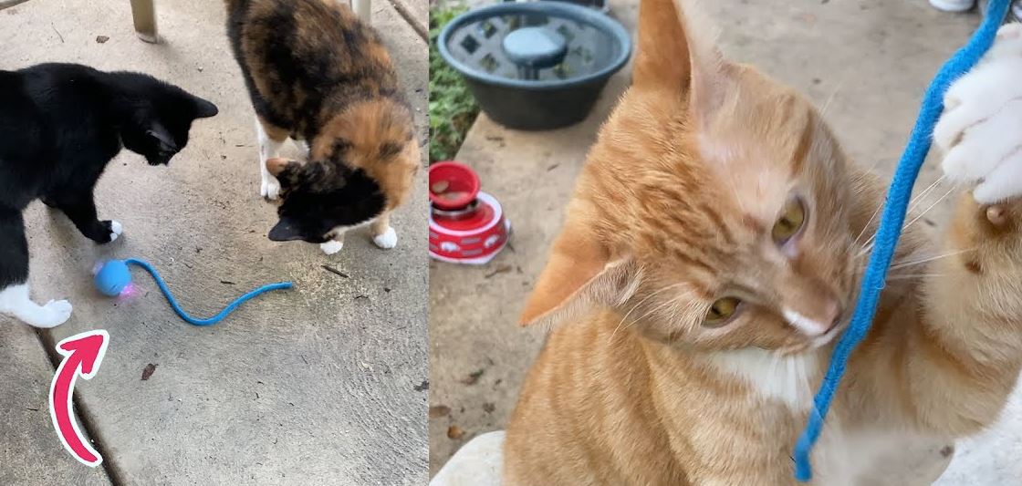 This robotic ball toy moves on all kinds of surfaces. We tested it indoors and outside on grass and rocks. Unlike other robotic balls we have covered, like the P16, this one also has bird sounds. It automatically stops after 5 minutes and stands by for 30 minutes if your cat wants to play more. It is made with food safe silicone. The battery is charged in an hour and lasts for up to 12 hours. The rope simply adds another random movement element to make this toy more interesting to your pets.