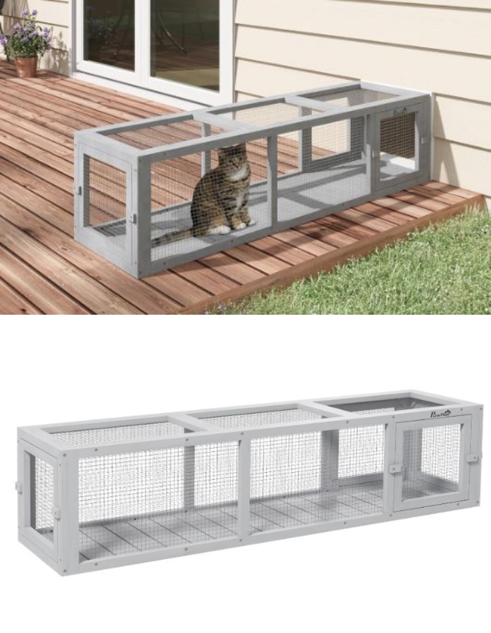 So you would like to give your pets a taste of outside without having to worry about them getting lost? The PawHut Extendable Outdoor Cat Tunnel can help. It measures 59 inch long and gives your cats plenty of room to explore. It has a fir wood construction with wire mesh walls. It is coated in water based paint for weather protection.