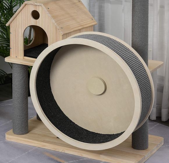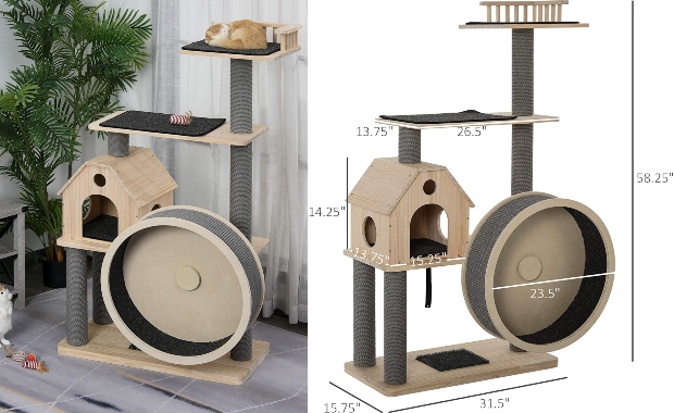 In the past few years, we have covered plenty of cool cat trees here. The PawHut Multi-Activity Center has everything your pets need to play and stay active. This 58.25″ cat activity center has a pine wood construction. It comes with sisal rope scratching posts, scratching board, perches, a condo, and a cat treadmill.