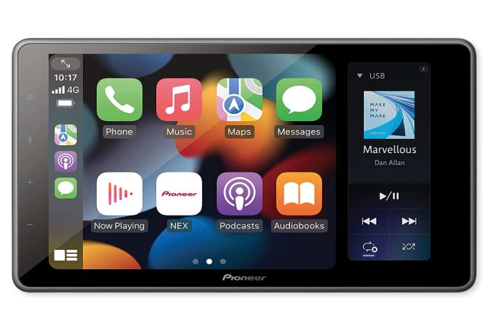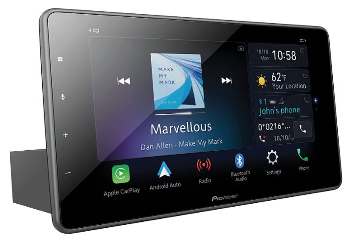 Meet the Pioneer DMH-WT3800NEX: a floating 9-inch in-dash multimedia receiver with Android Auto, Apple CarPlay, and Bluetooth support. The display has dark & light modes as well as a split-screen function, so you can access other functions without exiting CarPlay or Android Auto.