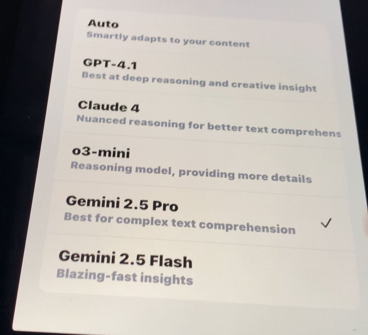 We found the companion app to be easy to use. It works like a charm with the recorder. The activation process was straightforward. Once you are set up, you can activate a recording and have it analyzed with the LLM of your choice. You can go with auto mode or pick from GPT 4.1, Claude 4, o3-mini, Gemini 2.5 Pro, and Gemini 2.5 Flash. We tested a bunch of these models with a few podcasts. Claude 4 and GPT 4.1 do a great job with summaries, but the other models are also very capable.