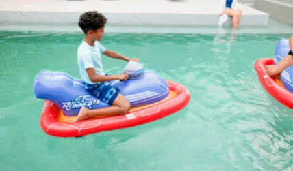 This is the Pool Candy Jet 2.0 Runner: a motorized inflatable ride-on watercraft that gives your kids a fun ride in your pool. It is driven by a 3-blade propeller and uses 66 watts motor to let riders steer it in every direction. This watercraft has 100lbs weight capacity, so it is ideal for kids up to 12.