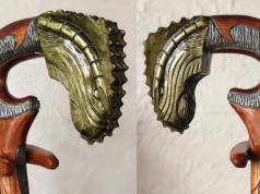 This gorgeous knife has two dragon-shaped brass carvings and a rosewood handle.
