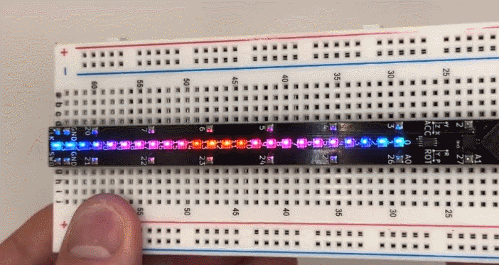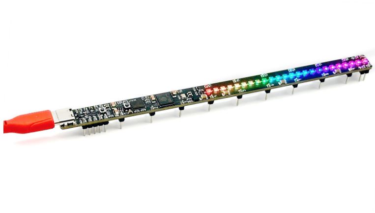 This is the Raspberry Breadstick: a Python compatible development board with everything you need to work on your coding and DIY electronics game. It has I/O pins spread out along its length, eliminating the need for long jumper wires. It has 24 RGB LEDs that you can control Adafruit DotStar or FastLED library. It can be used to gather rotation and acceleration data with its 6-axis IMU.