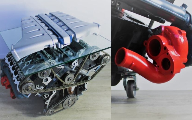 Ben’s Automotive Decor is behind some of the coolest engine tables we have seen. Their Rotating Bentley W12 Twin Turbo Engine Coffee Table is also worth a look. When switched on, the internals of the engine operate like they would inside a running engine. You will be able to see inside of the cylinders.