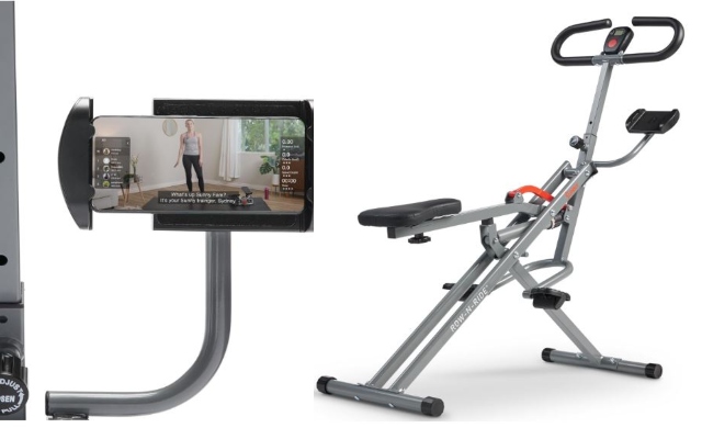 The Row-N-Ride Pro Smart squat trainer has a convenient smartphone holder. This model has max capacity of 265lbs. Its seat and handlebars are adjustable. It has Bluetooth connectivity. This model has a footprint of 44.1 x 19.3 x 48.2″.