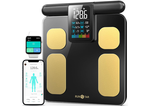 This scale uses bio-impedance measurement technology and works with your smartphone to help you make sense of your data. Its app lets you create 24 profiles for your family. You can also easily sync to Apple Health, Google Fit, and other apps. This scale has a handle with 4 electrodes. Its body has 4 more large electrodes. The Starfit app also has an Apple Watch interface.