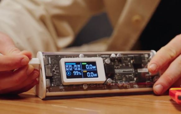 This cool power bank has 2 x USB-C and a USB-A port. It can go from 0 to 50% in 20 minutes. It also has pass-through charging. It has electric vehicle batteries that maintain 80% capacity after 800+ charges.