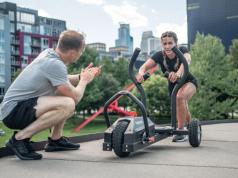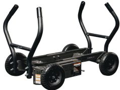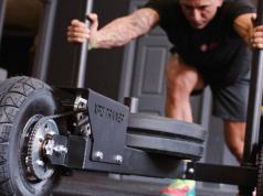 This sled has 4 fat tires with deep grooves. The recommended pressure for them is 30psi. The above video shows what this push sled has to offer.
