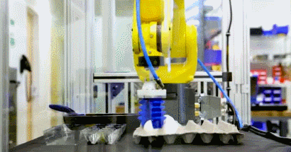 There are plenty of robots capable of picking and placing items. Fragile items such as eggs need special grippers though. Soft Robotics has developed soft grippers from FDA compliant materials that enable robot arms to remove eggs from cartons and move them without any damage.