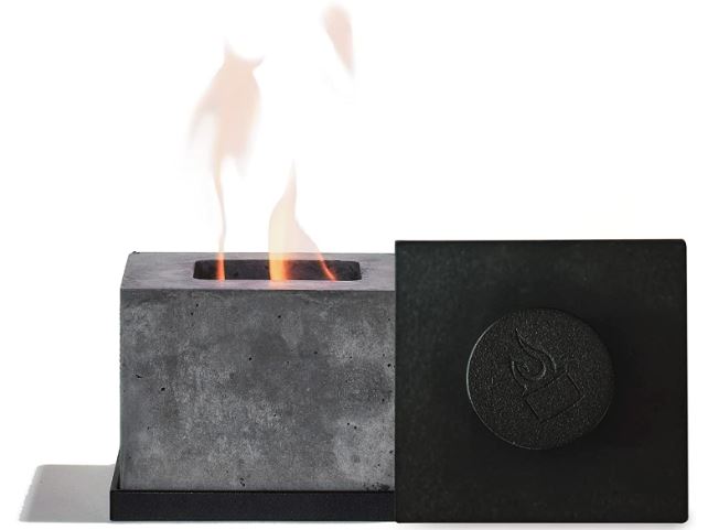 This is the FLIKR Fire (Square): a personal fireplace that operates on rubbing alcohol. It holds 5 ounces of 70% or 91% isopropyl alcohol. It doesn’t produce carbon monoxide and is safe to cook over. FLÎKR Fire doesn’t produce too much heat. It ships with a convenient sniffing lid.