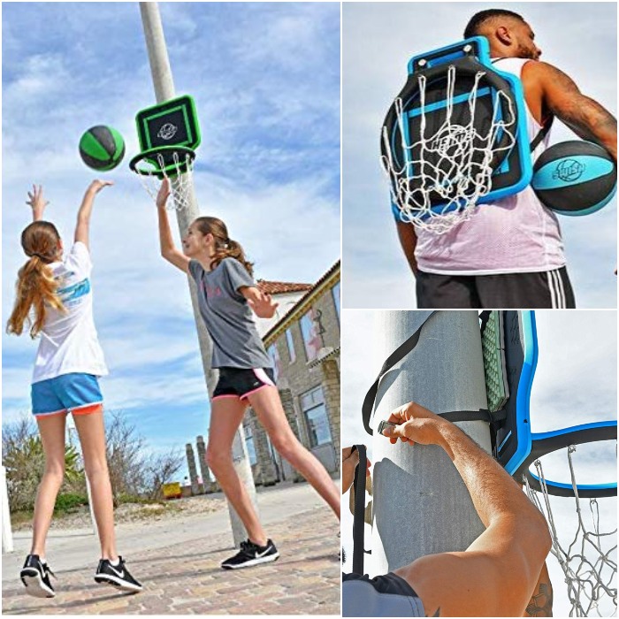 Here is a portable hoop that you can easily take anywhere to play basketball. The Swish Hoop features a backboard, net, and removable net hooks. You also get a basketball that you can inflate using the included air pump.