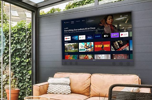 This TV is rated for -22°F to 122°F. It is great for use on your deck, porch, and anywhere in between. Thanks to Google Assistant support, you can use your voice to control it. This TV has 3 x HDMI and 2 x USB ports.