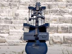 Meet the Syrena: a 6-string hand carved guitar with a body made of two layers of aged and air-dried walnut (made from a batch of walnut rescued from the Missouri River). The front of the guitar is a single piece of walnut. The details are very well-executed.