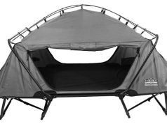 This camping tent has a weather resistant design and a metal frame strong enough to handle up to 300lbs. It keeps you 16.5″ above the ground to keep you away from dirt.