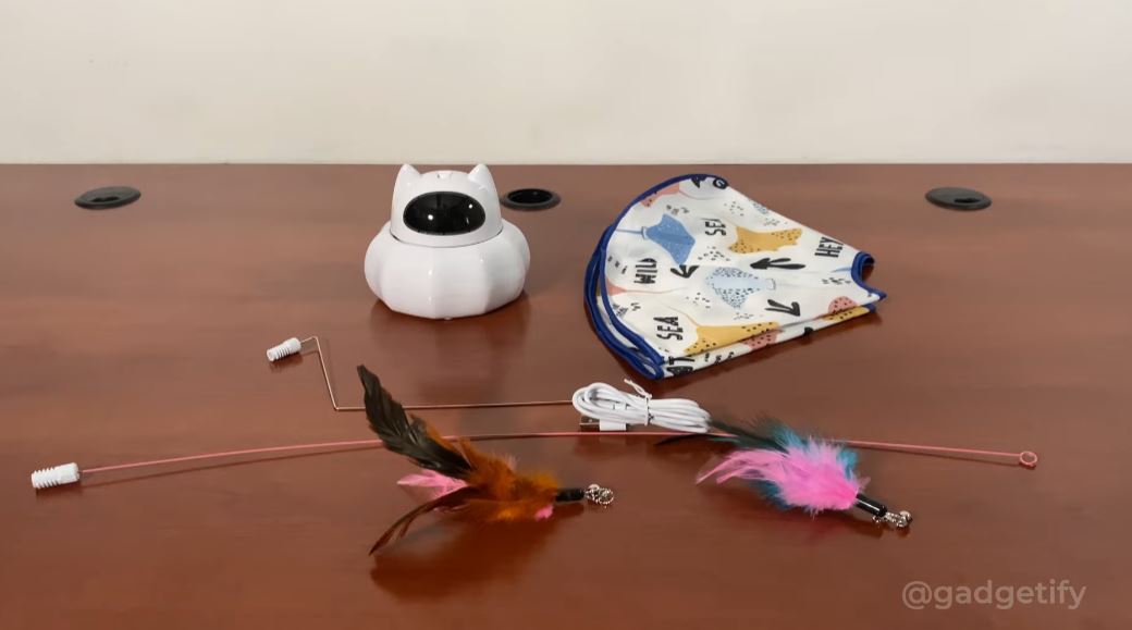 Our toy came with two feather holders, the main toy, a cover, and a charging cable. You can use it with or without the cover. The short feather holder goes under the cover to grab your cat’s attention. The longer feather holder can be used as a handheld toy.