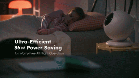 This fan has a touchscreen display. It has a noise rating of 36dB. You can adjust wind speed from 1 to 4 by pressing the wind speed button. It also has a timer for up to 8 hours.