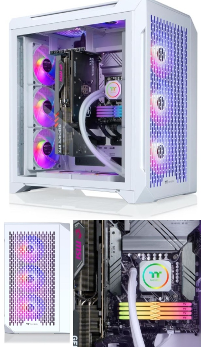 This PC is cooled with a 420mm ARGB AIO. It has a 1000W 80Plus Gold Power Supply. You can customize lighting effects and sync 14x Thermaltake CT140 ARGB Sync fans, AIO water block, and memory.