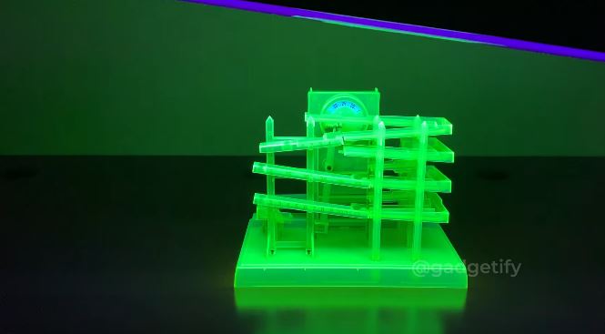 Here is a kinetic ball clock that puts on a show as it tells time with rolling balls. It has a body that is reactive to blacklight. It is easy to put together and runs on batter/AC adapter.